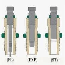 Die sets for straight wall cases contain three dies. This is necessary because it is not possible to full length resize straight wall cases and expand the neck for proper bullet fit in one operation. The full length (FL) resizing die contains a decapping rod assembly. The expander die (EXP) contains a neck expanding plug. The seating die (ST) includes bullet guide built-in crimp ring and the proper seating plug.
