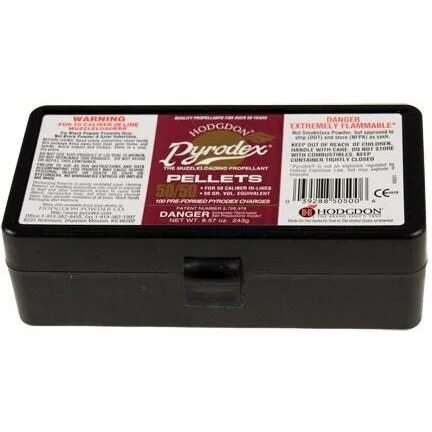 These Pyrodex Pellets from Hodgdon were specifically designed for use with .50-caliber inline rifles. You have the option to use one pellet or two pellets at a time depending on the application. For small game or light targets use one 50/50 pellet. For larger game use two 50/50 pellets to create a 100-gram equivalent.