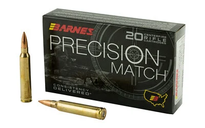 With the introduction of the most accurate commercially loaded round on the planet, Barnes enters the world of match ammunition in 2015 with Precision Match. As a proud supplier of precision ammunition to America’s Military Elite, Barnes makes top tier ammunition commercially available for the elite, technical shooter who demands uncompromising performance. Precision Match Ammunition delivers exceptionally accurate, long range allowing the shooter to SEND IT WITH CONFIDENCE every time. Precision Match, engineered for precision at extreme distances, features exceptionally low standard deviations and extreme variations due to Barnes’ exacting manufacturing and quality standards. Precision Match rounds are loaded with a match grade OTM (Open Tip Match) BT projectile featuring a long boat tail and high B.C. As an additional bonus, scan the QR code located on the back of each box to view Doppler radar generated drop tables specific to each load. Precision Match will be offered in 5.56 X 45MM 69 grain OTM BT, 5.56 X 45MM 85 grain OTM BT, 6.5 Creedmoor 140 grain OTM BT, 308 Win 175 grain OTM BT, 300 Win Mag 220 grain OTM BT, and 338 Lapua Mag 300 grain OTM BT.