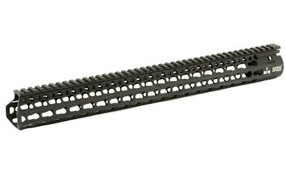 Bravo Company’s BCM KMR ALPHA 17″ KeyMod Free Float Handguard is manufactured from aluminum that is lightweight yet durable. It also features a proprietary patent pending mounting indexing and lock up system that mitigates 12:00 rail movement under heat generated from the barrel nut. Inner diameter is 1.3 inches and the outside is 1.5 inches flat to flat. The handguard flares forward (towards muzzle end) at the 3 and 9 O’clock positions approximately 1/4 inch and the actual length when measured to flare is 10.5 inches. The KeyMod interface system was developed by Eric Kincel (now the Director of BCMs’ product development team) to work in parallel with the current picatinny system. In many applications it will advance modularity past the current 1913 rail system. The BCM KMR Alpha also allows for a larger range of modularity offering 4 different offset mounting positions between traditional 3″ 6″ 9 and 12:00 positions. In the most basic of applications the KeyMod system allows for universal modularity between various manufacturers of accessories and accessory rails. A big win for the trigger puller.