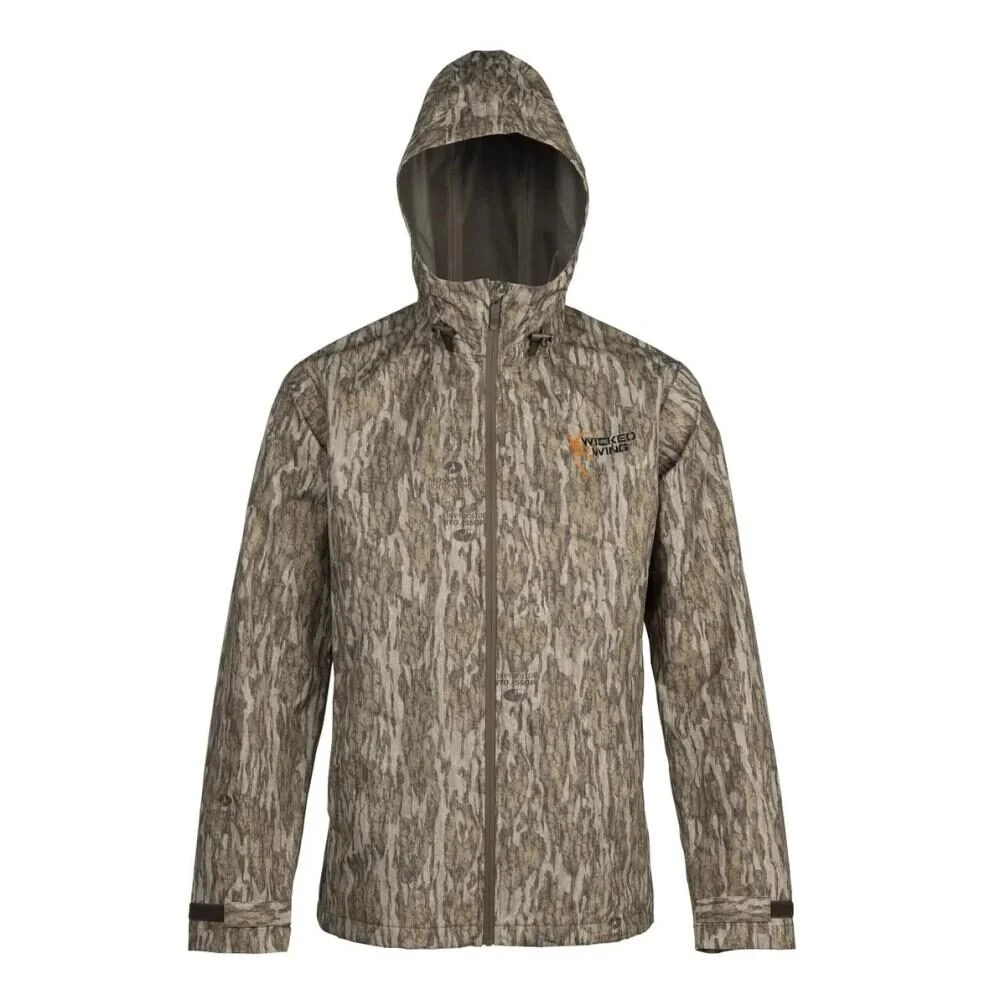 Duck hunting and rain are synonymous. Good thing there's a Rain Shell Jacket in the Browning Wicked Wing line up. The Rain Shell Jacket is made to keep you dry and comfortable while waiting for the birds to fly even when nature isn't cooperating. The key feature is the reliable Pre-Vent Plus membrane that rivals the performance and durability of leading waterproof/breathable garments. Fully-taped seams ensure that these often overlooked points of entry are sealed against the elements. The outer shell fabric is tough enough to shrug off brush and has an additional water-resistant DWR coating that provides greater protection from moisture. If the rain subsides this jacket is light enough to stuff away inside its own pocket. It also features water-resistant zippers on the front and hand pockets. The three-piece hood is adjustable for added comfort and to optimize performance in the elements.