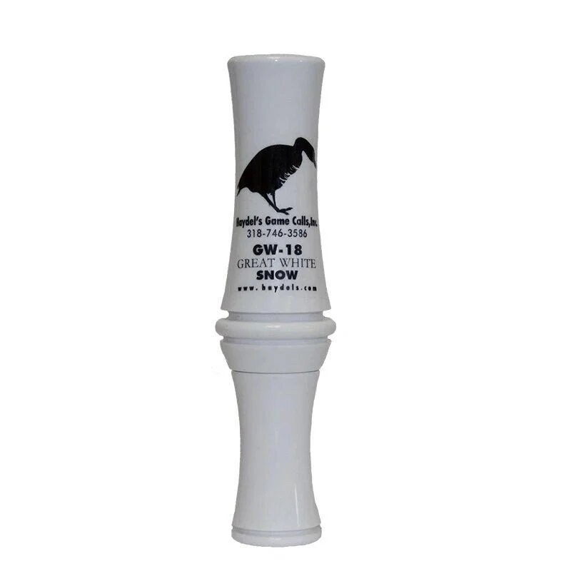 The GW-18 GREAT WHITE SNOW GOOSE CALL. The Great White Snow goose call Features a hybrid design acrylic tone board for extra volume and ease of blowing. Many pitches can be achieved with this call simply by opening or closing your hand.
